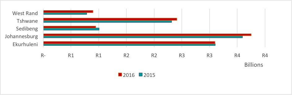 There is growing consensus that public health budgets are insufficient to meet the demand for services, however work to ensure efficiency and effectiveness of spend has slowed. Gauteng is a good example of this. Despite the potential for powerful market negotiations based on scale, through transversal provincial tenders, the Province has not managed to secure many of these. The expenditure on Primary Health Care (PHC) by district is shown in Figure 1 below. West Rand, City of Tshwane (CoT) and City of Johannesburg (CoJ) show an increase in expenditure from 2015/16, with West Rand ~14% more, and CoT and CoJ at a 4% increase each, which is below inflation. Sedibeng shows a 6% decrease. The declining spend on PHC is not only against stated policy and the National Health Insurance (NHI) White Paper’s emphasis on primary care, but is also bound to have a knock-on effect on population health and overall health spend, due to care being accessed later down the line or at a higher level than is necessary.