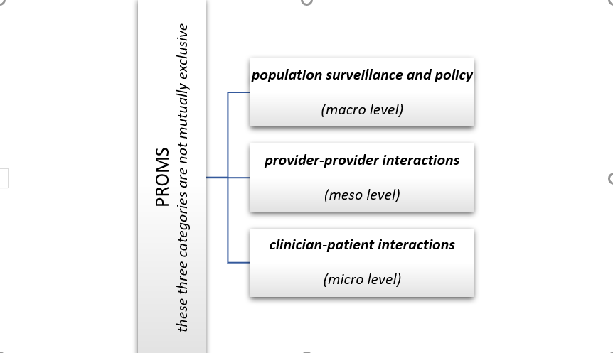 Lastly, ensuring that analysis is done at the appropriate level is difficult. In countries with PROMs reporting, it is often at institutional level (e.g. hospital level) at present. While this may be appropriate for some interventions, the individual practitioner may be the correct level for other interventions, such as surgery. (5)
