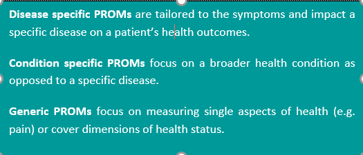 There are two broad types of PROMs: disease specific and generic (5). For any particular investigation, usually both disease specific and generic PROMs are used to assess patient outcomes as they can provide complementary information (1).